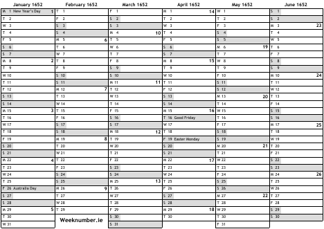 1652 calendar