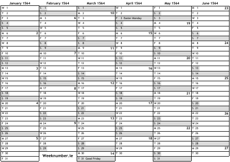1564 calendar