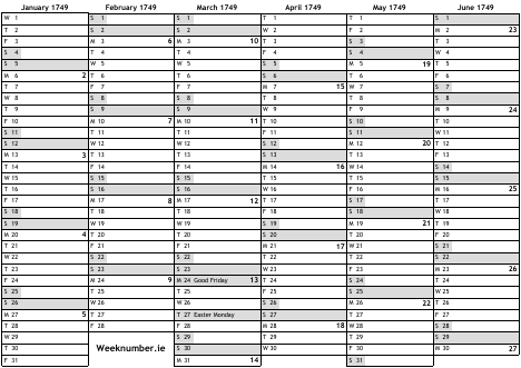 1749 calendar
